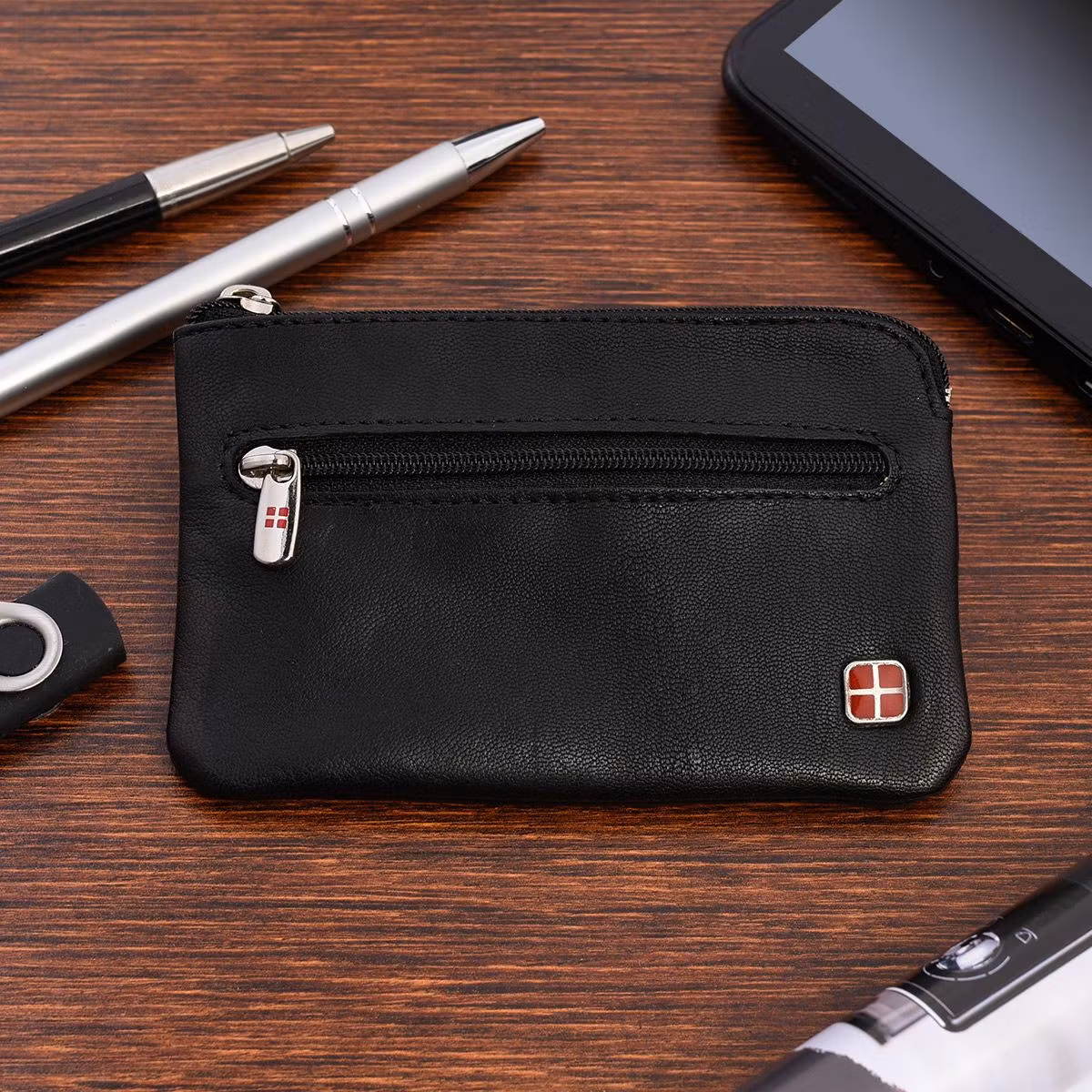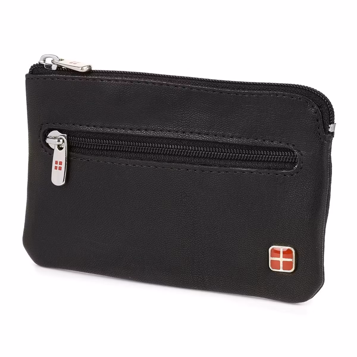 Svart lädernyckelpåse, dokumentpåsefodral, nyckelring Swiss Cross